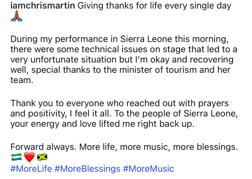 Christopher Martin says he is okay and recovering well after falling off stage on Saturday during a performance at the Radisson Blu in Sierra Leone.