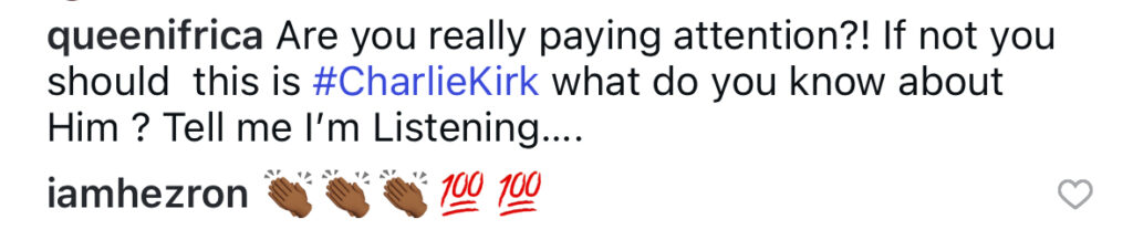 In her Instagram post, she wrote, “Are you really paying attention? If not you should. This is #CharlieKirk what do you know about him? Tell me I’m listening…”
