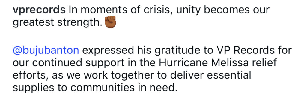 Buju Banton is expressing gratitude to VP Records for their support in providing aid to Jamaicans impacted by Hurricane Melissa.