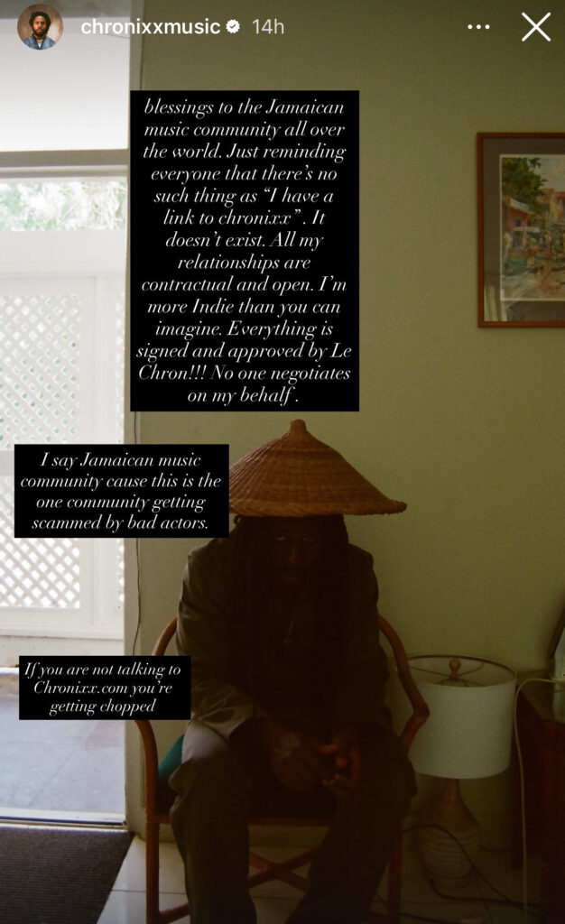 Reggae artist Chronixx is warning the public to be cautious as scammers continue to claim they have direct access to him. The singer addressed the issue in an Instagram story, reminding the Jamaican music community that no one is authorized to speak or negotiate on his behalf.