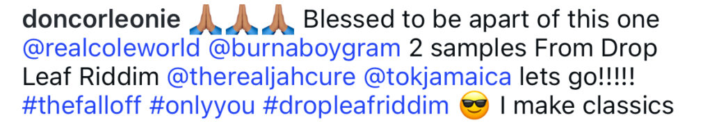 Rapper J. Cole and Afrobeats superstar Burna Boy have both sampled Don Corleonie’s iconic 2005 Drop Leaf Riddim, further solidifying its lasting global influence.