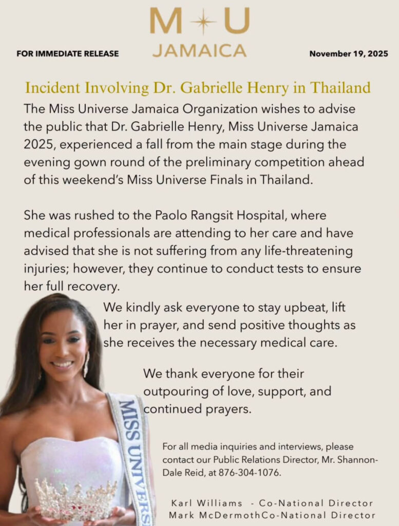 A release from the Miss Universe Jamaica Organisation confirmed that she did not suffer any life-threatening injuries. However, medical professionals are conducting tests to ensure her full recovery.