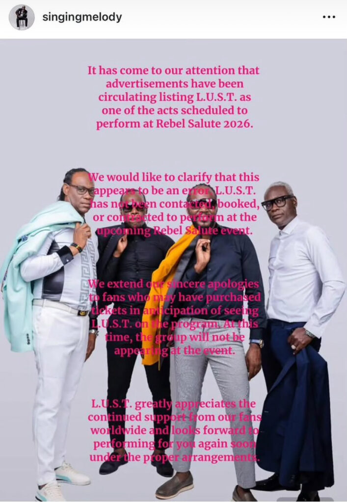 According to Singing Melody, L.U.S.T. has not been contacted or contracted and is not booked to perform at the 2026 staging of Rebel Salute. He also issued an apology to fans who may have purchased tickets expecting to see the group on the lineup.