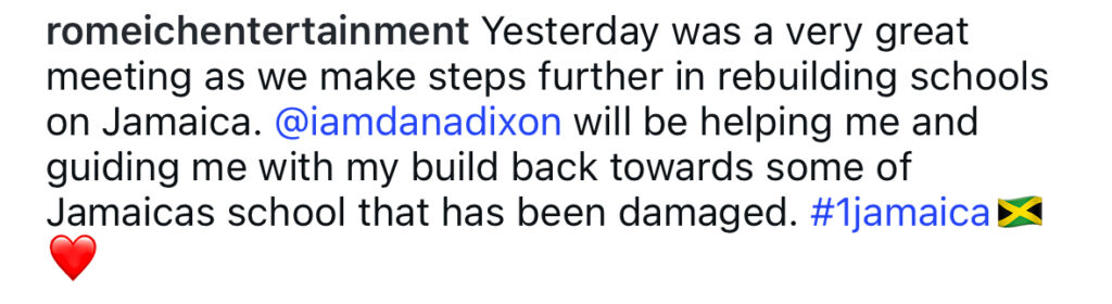 “Yesterday was a very great meeting as we make steps further in rebuilding schools in Jamaica. @iamdanadixon will be helping me and guiding me with my build back towards some of Jamaica’s schools that have been damaged. #1Jamaica.”