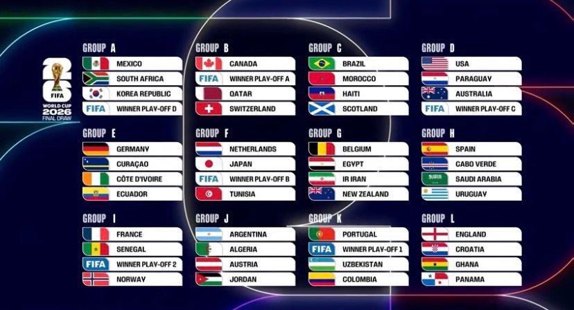 Elsewhere in the draw, co-hosts Mexico headline Group A, where they will face South Africa, Korea Republic and the winner of the UEFA Playoff Group A showdown. Joint host nation Canada anchors Group B with Qatar, Switzerland and the winner of the UEFA Playoff Group B qualifier.
