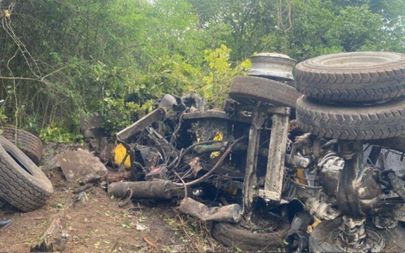 Reports are that about 10:00 A.M. the truck laden with asphalt was travelling along the road when it overturned.