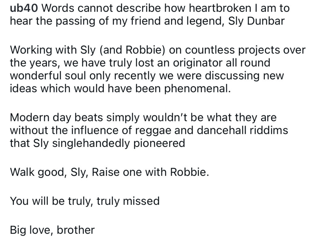 The band also underscored Sly’s lasting influence on modern music, noting that today’s beats would not exist without the reggae and dancehall riddims he pioneered.