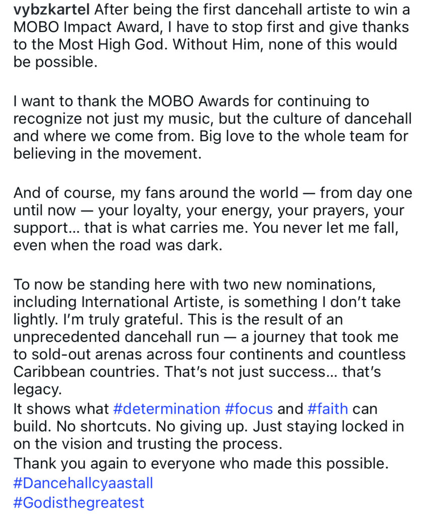 In a lengthy post, Vybz Kartel thanked the MOBO Awards for the recognition. He wrote, “After being the first dancehall artist to win the MOBO Impact Award, I have to first stop to give thanks to the most high.”