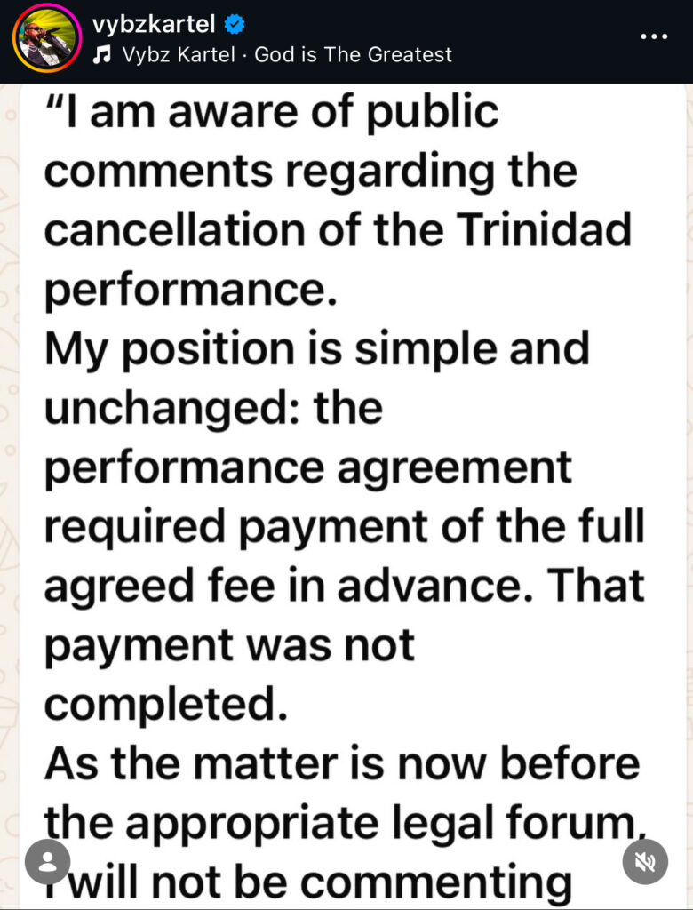 Vybz Kartel was contracted to headline the event for US$1.35 million but allegedly did not travel to Trinidad following a payment dispute. The matter has since been filed in the High Court of Justice.